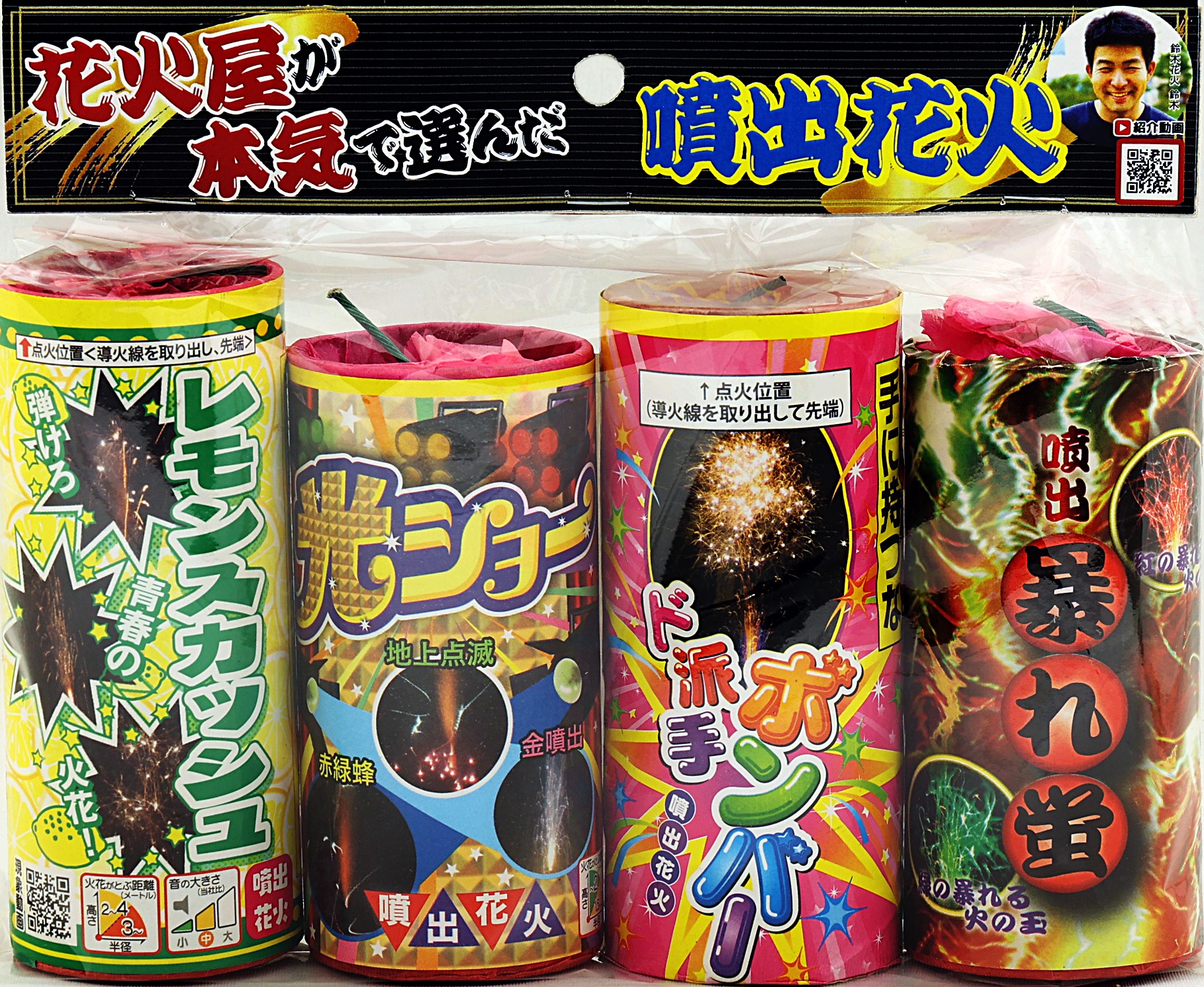 弾ける迫力、カラフルな色、超高く噴き上がる、ユニークな動き。花火屋が選んだぜひ遊んでほしい噴出花火4種類詰め合わせ!