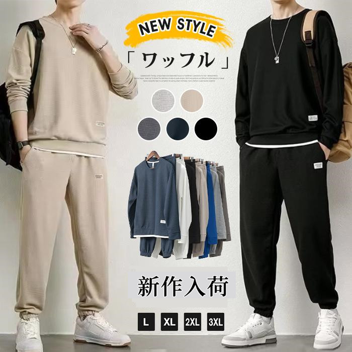 ワッフル 上下セット メンズ セットアップ 長袖 トレーナー ロングパンツ スウェットパンツ ウエストゴム ボトムス カジュアル おしゃれ かっこいい 重ね着風 通勤 通学 部屋着 運動着 ファッション 秋新作 新作