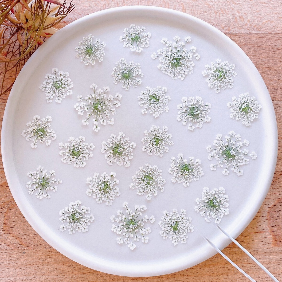満開のレースフラワーを押し花にしました!天然無着色のお色味です。アクセサリー制作などにお役立てください♪サイズは画像3枚目でご確認いただけます。