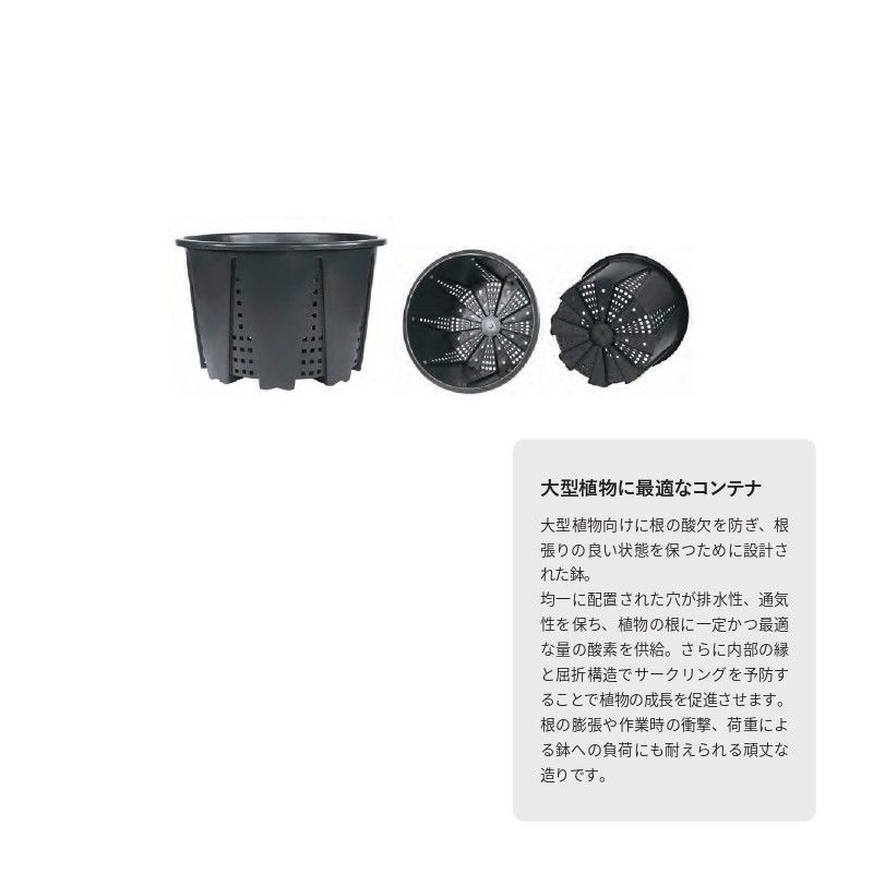 [特徴]【ナーセリー〜育苗・栽培に最適な鉢〜】温度変化に強く耐久性や柔軟性に優れた再生ポリエチレンを使用した低床式育苗ポット。根の育成を促す黒色で、サイズ展開も豊富です。バリアは「大型植物に最適なコンテナ」です。大型植物向けに根の酸欠を防ぎ、根張りのいい状態を保つために設計された鉢。均一に配置された穴が排水性・通気性を保ち、植物の根に一定かつ最適な量の酸素を供給。さらに内部の縁と屈折構造でサークリングを予防することで植物の成長を促進させます。根の膨張や作業時の衝撃、荷重による鉢への負担にも耐えられる頑丈な造りです。