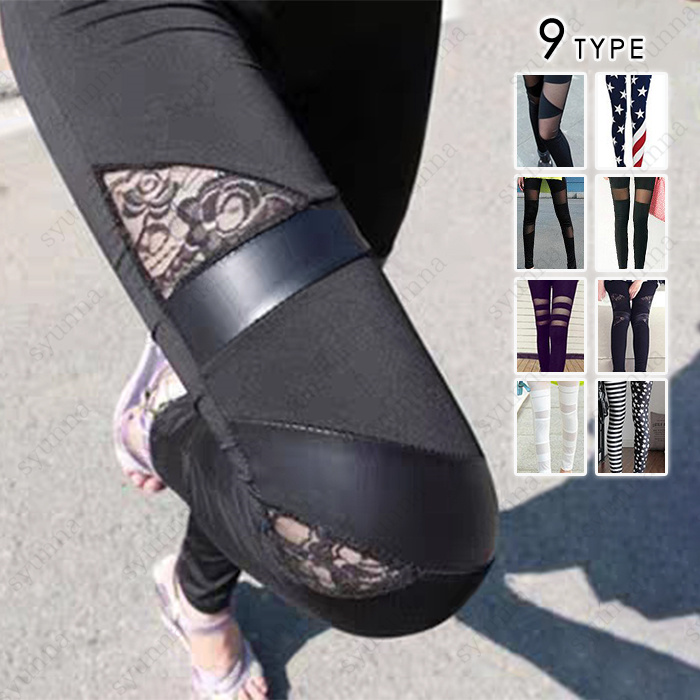 RG66#レギンス レディース スポーツ ボトムス レース切替 ストレッチ フリーサイズ 無地 ウエストゴム 美脚 伸縮性 フェイクレザー パンツ 10丈