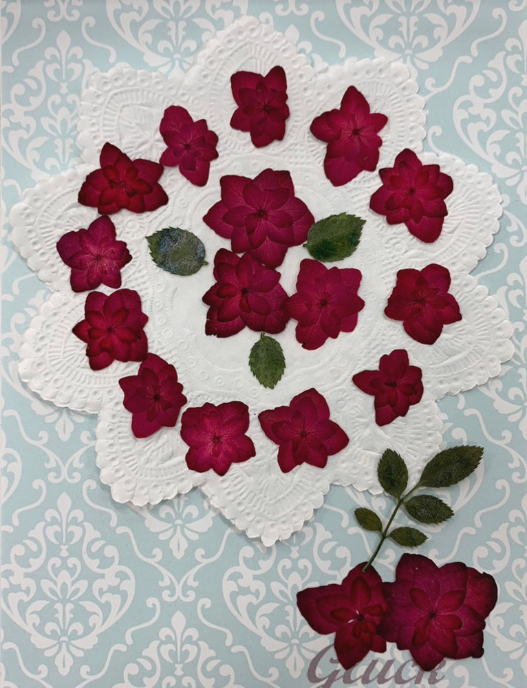 <商品について> ルビーに吸い上げ着色した薔薇咲きの八重あじさい17枚、バラの葉大1枚・小3枚、合計21枚の少量パックにしてお届けします。 お求め頂き安い少量パックにしてお届けします。こちらの押し花とUVレジンを使用してオリジナルのスマホケースや名刺入れが作成できます。オリジナルのデザインを作成することが可能です。