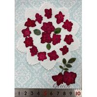 ルビーに吸い上げ着色した薔薇咲きの八重あじさい17枚、バラの葉大1枚・小3枚、合計21枚の少量パックにしてお届けします。