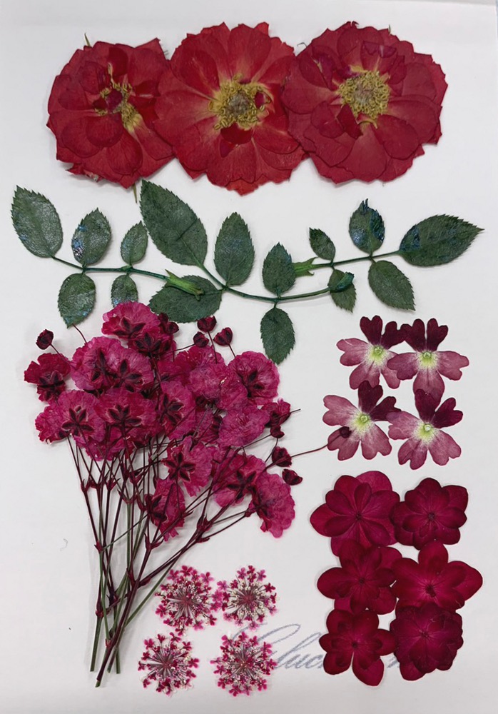 <商品名>【お花屋さんの押し花セット 令和レッドMix】人気のお花をチョイス ミニバラローザ バーベナ 八重あじさい かすみ草 ミニバラ葉