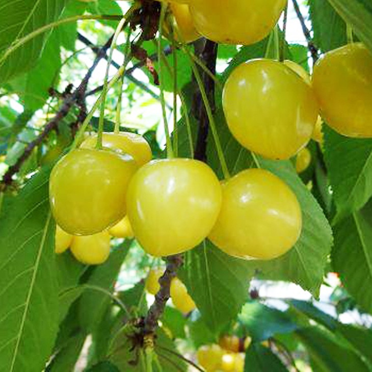 一粒9g前後と、一般的な国産のさくらんぼに比べると大粒で、アメリカンチェリーのビングと比べても大きい方です。最大の特徴は何と言ってもその色で、艶のある明るい黄色をしています。果肉は締りがあり、酸味があまり感じられず、甘さが口の中に広がります。