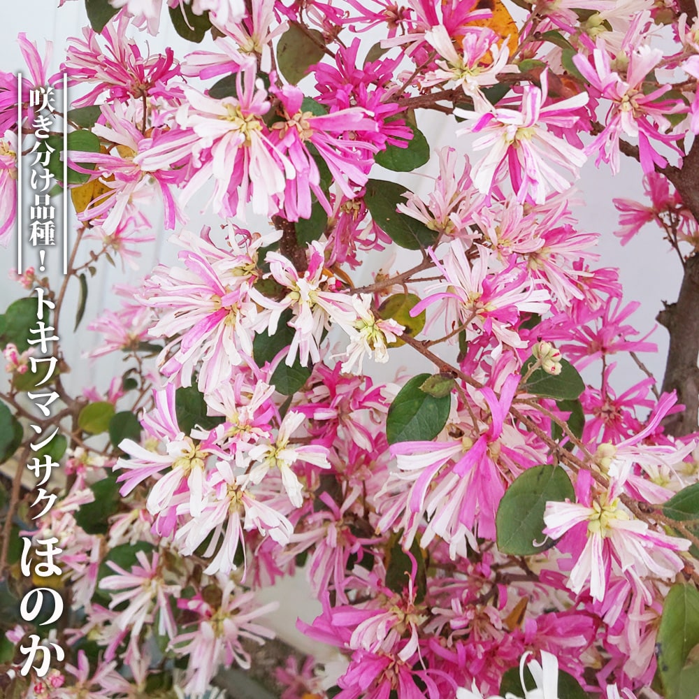●品種の特徴「ほのか」は、花弁が短くて広くやわらかい感じに咲き分ける絞り品種です。従来種「源平トキワマンサク」よりよく咲き分けます。