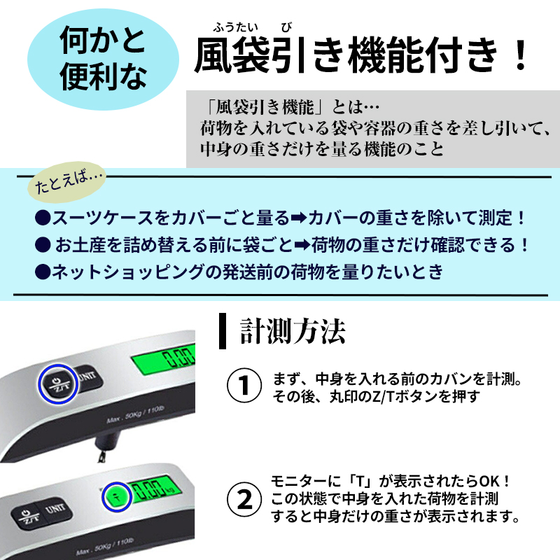風袋(ふうたい)引き機能付きで、容器を除いた中身の荷物の重さだけを正確に量りができます。