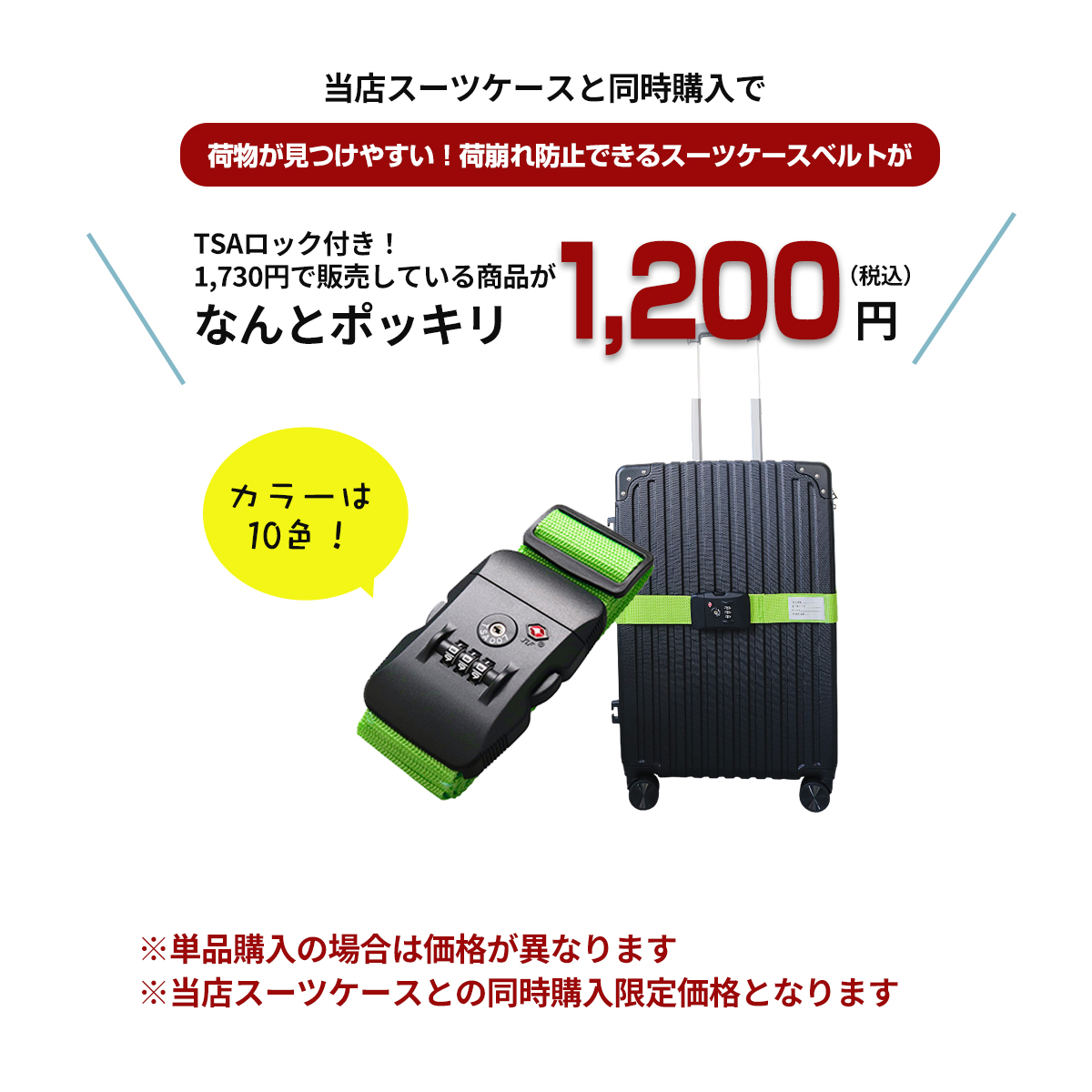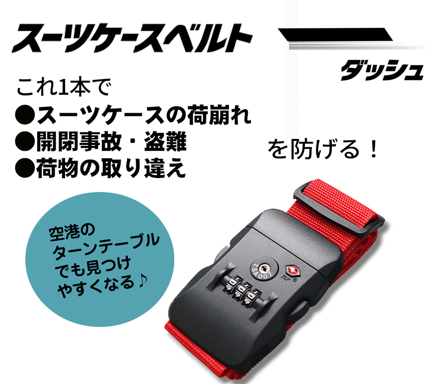 旅をもっと快適にする「スーツケースベルトー(ダッシュ)」は、 荷崩れや盗難を防ぎ、目立つので空港のターンテーブルで荷物探しもラクラク! | |