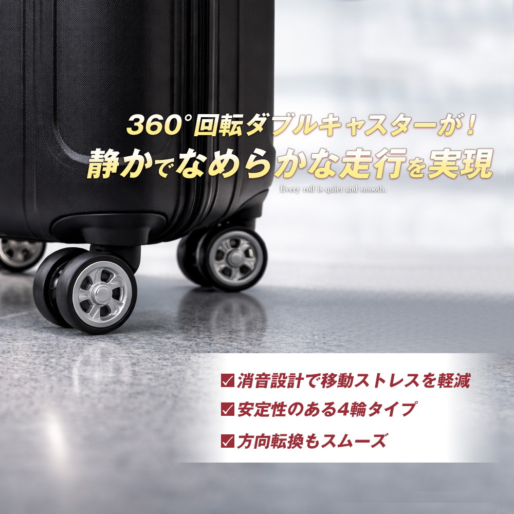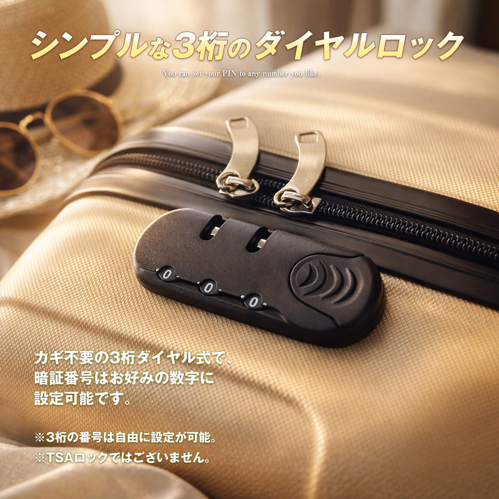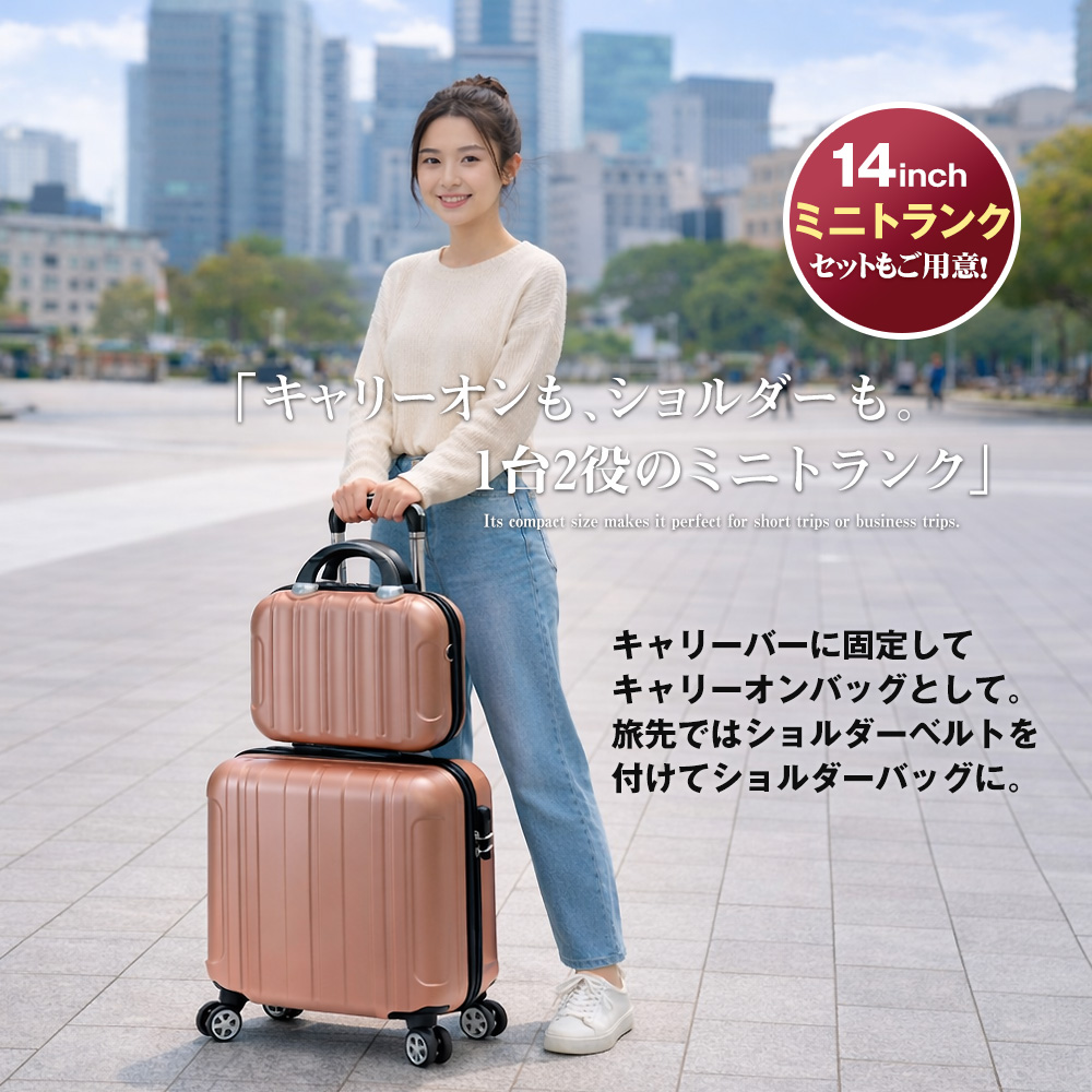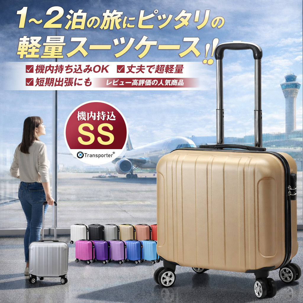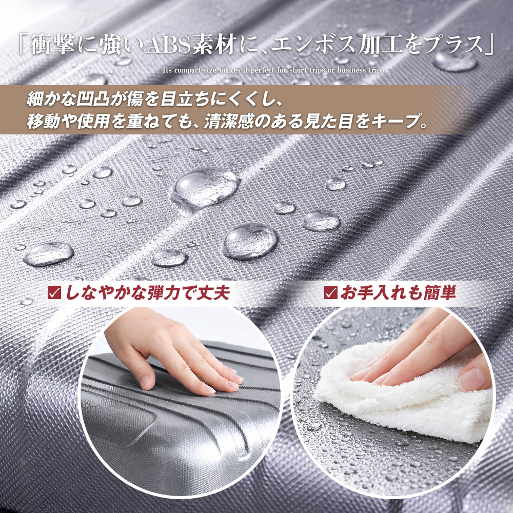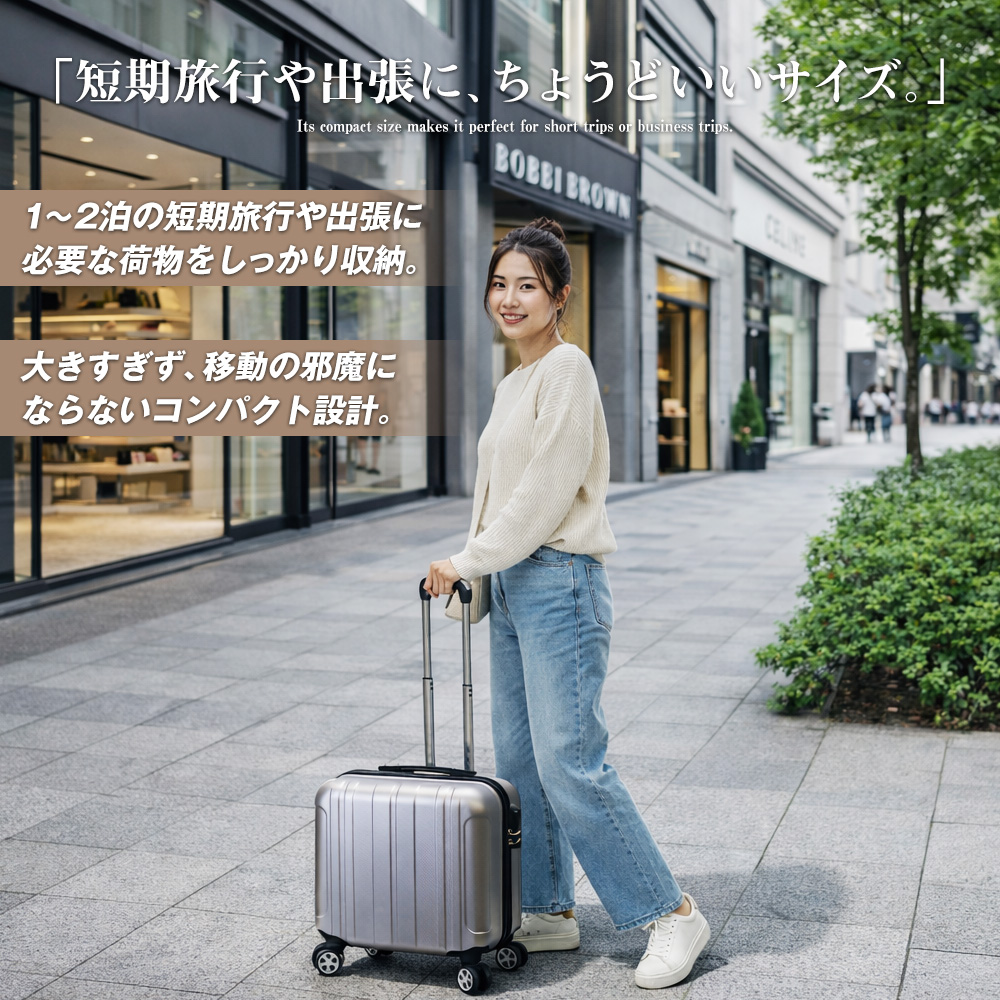 | 【機内持ち込み対応・軽量設計。移動を快適にするハードタイプ スーツケース】 1〜2泊の短期旅行や出張に最適な、機内持ち込み対応サイズのスーツケースです。 軽量設計で持ち運びやすく、移動時の負担を軽減します。 ■機内持ち込み対応サイズ 航空機の機内持ち込みに対応したサイズ設計。 預け入れの手間がなく、空港での移動もスムーズです。 1〜2泊程度の旅行や出張に最適です。 ■軽量なのに丈夫なハードシェル 本体にはABS素材を採用。 軽量でありながら耐久性が高く、移動中の衝撃やキズから荷物をしっかり守ります。 エンボス加工により、汚れや小キズが目立ちにくいのも特長です。 ■スムーズに動く4輪キャスター 安定感のある4輪キャスターで、空港・駅・街中でもスムーズな走行を実現。 重たい荷物を入れても操作しやすく、快適に移動できます。 ■シンプルで飽きの来ないデザイン 無駄のないシンプルなデザインで、男女問わず、年齢を問わず使いやすい仕上がり。 出張・旅行・帰省など幅広いシーンで活躍します。 ■ こんな方におすすめ 「機内持ち込みできるスーツケースを探している方」 「軽量で持ち運びやすいモデルが欲しい方」 「1〜2泊の旅行や出張用を探している方」 「シンプルで長く使えるスーツケースが欲しい方 」 | |