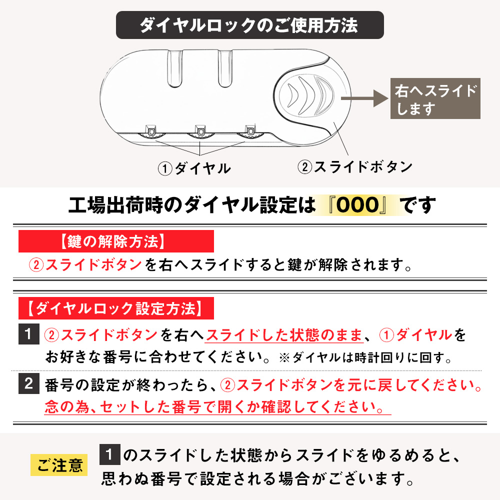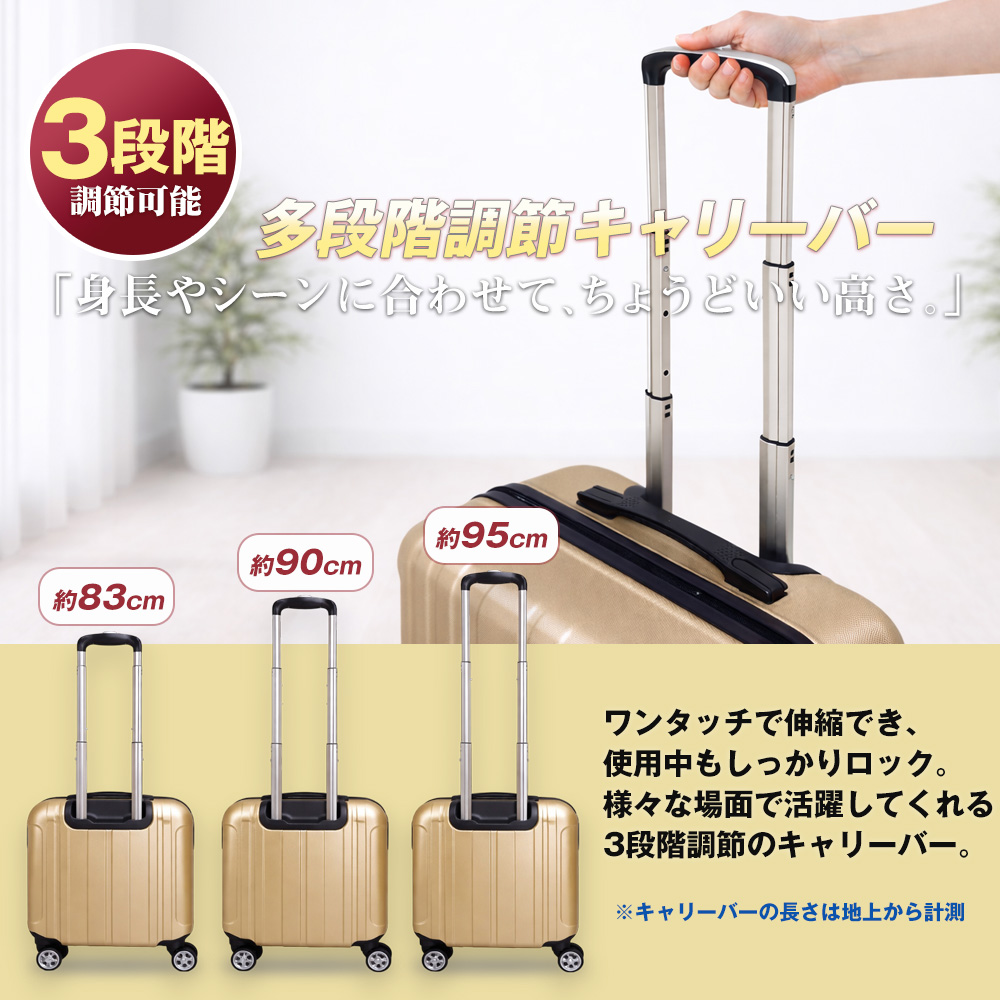 | ■スーツケース【機内持ち込み】について 国際線・国内線(100席以上)の機内に持ち込みに適合したサイズとなっております。 LCC・MCCを除く航空会社で機内持ち込みしていただけます。また路線、飛行機の種類により機内に持ち込む事が出来ない場合がございますので、予めご了承願います。 ■キャリーバーで本体を持ち上げないで下さい。 ■キャリーバーには生産時に使用する潤滑油が付着している場合がございます。その場合は拭いてからご使用ください。 ■不整地ではご利用いただけません。 ■商品サイズ・カラーは、企画サイズとなります。 ■掲載の商品画像につきましては、モニターの種類・設定等により、実際の商品とは素材感や色味が異なる見え方をする場合があります。 ■細かなキズや、製造上避けられないシミ・シワなどがある場合があります。 ■商品仕様は、予告無く仕様変更される場合がございます。 ■アウトレットにて販売しております。アウトレットの訳有り品として ・多少の傷や汚れがある ・チャックが少し固い ・縫製が少し甘い ・縫製のラインが少し歪んでいる ・ミシンで縫いすぎて糸をほぐした跡がある ・梱包には再利用箱を利用している ・タグのついていない商品がある ・多少のにおい等(接着剤やクリーニング液)が残っている ・その他ご使用に問題のない物等など といった上記の状態の商品が含まれている場合がございますが、予めご了承願います。 | |
