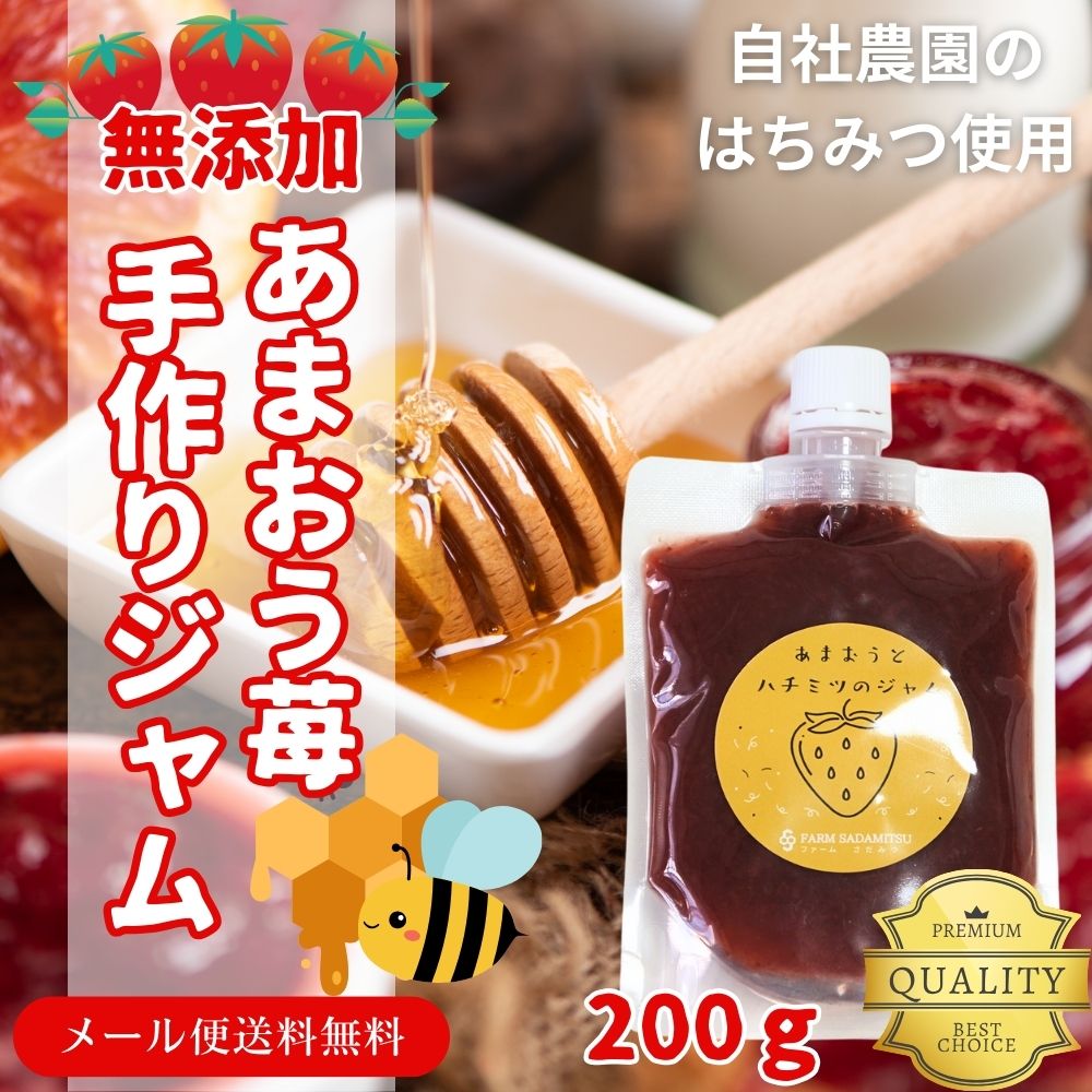 | あまおう苺と蜂蜜を使って、作ったいちごジャム。(砂糖の代わりにハチミツをつかった、砂糖不使用のジャムです。)イチゴ農園(福岡県直方市 貞光園芸)が丹精込めて作ったあまおうイチゴを、生産者自信が心を込めて手作りした、爽やかな甘さのいちごジャムです。本農園において、原材料の仕入れから、加熱、調味、瓶詰めまでの全工程を行っております。 |