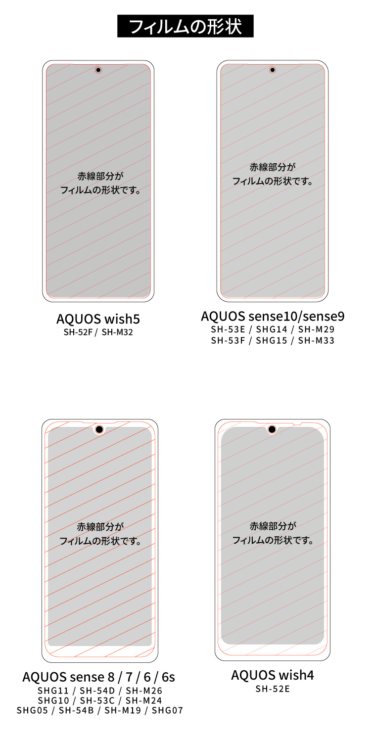 ※一部の機種(フチがラウンドしているモデル)は全体を覆うと端に空気が入るため、液晶画面よりも小さめに作られております。