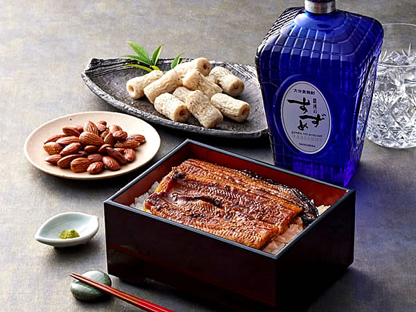 | 詰合せ内容 | 極上豊橋うなぎ 1尾(約140g) 黒胡椒豆ちくわ 1袋 えそ醤油アーモンド 1袋 銀座のすずめ ガスライト 麦焼酎原酒 35゜ 720ML1本