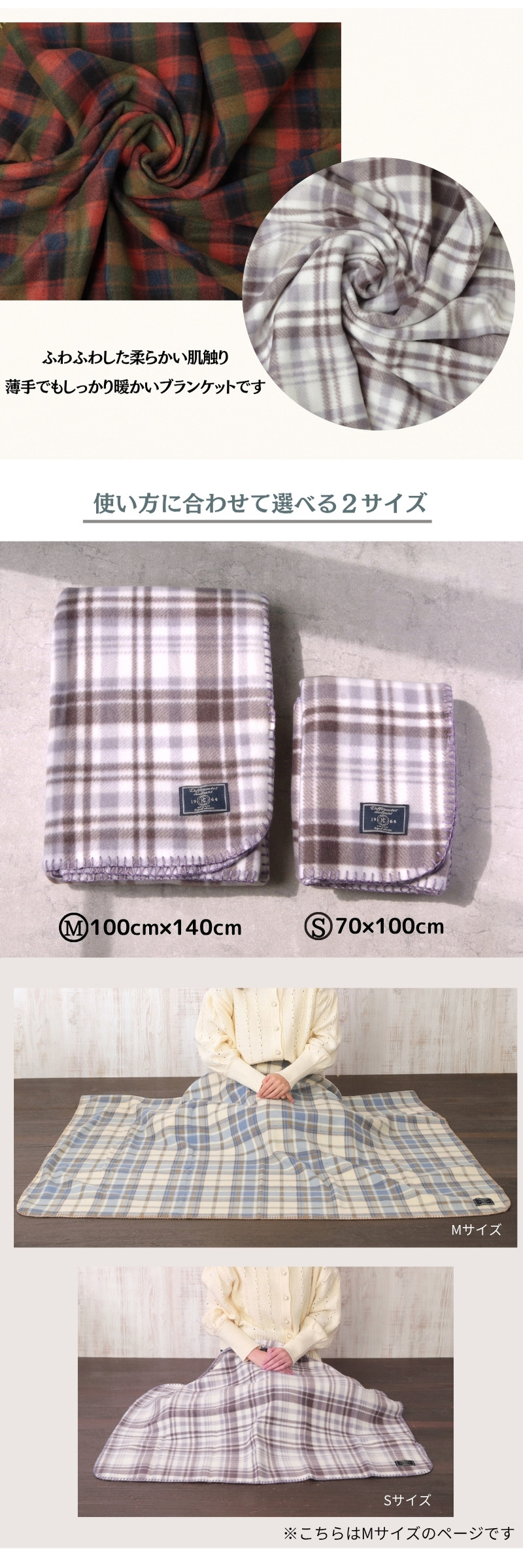 【薄手 フリースブランケット Mサイズ チェック柄 ステッチ入り (100×140cm) 】