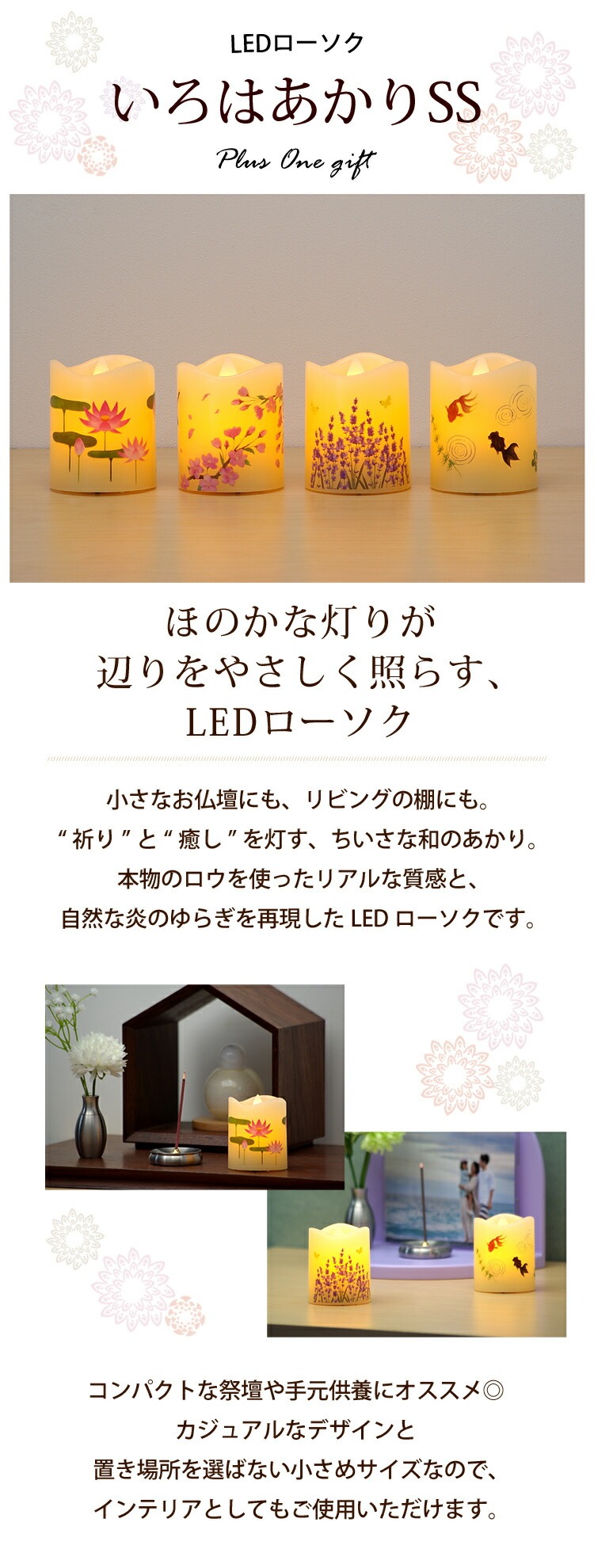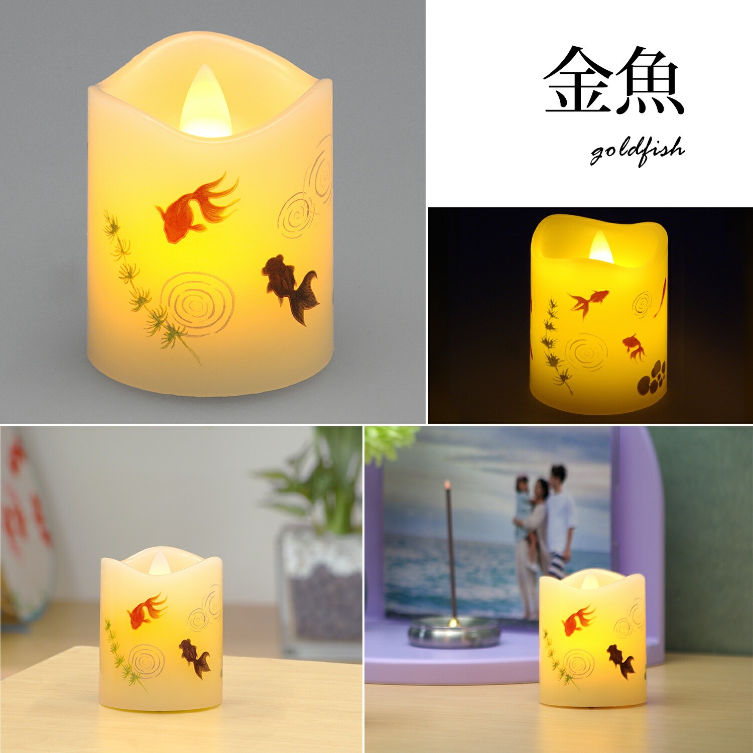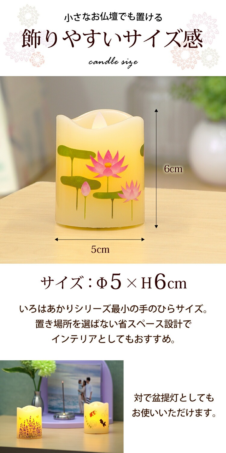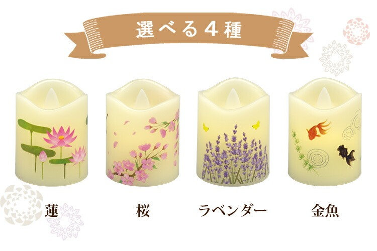 ◆カメヤマ いろはあかりSS LEDローソク (テスト用ボタン電池 CR2032 2個付き) ・蓮 ・桜 ・ラベンダー ・金魚 連続点灯時間:約45時間 小函寸法:W55×L55×H75mm