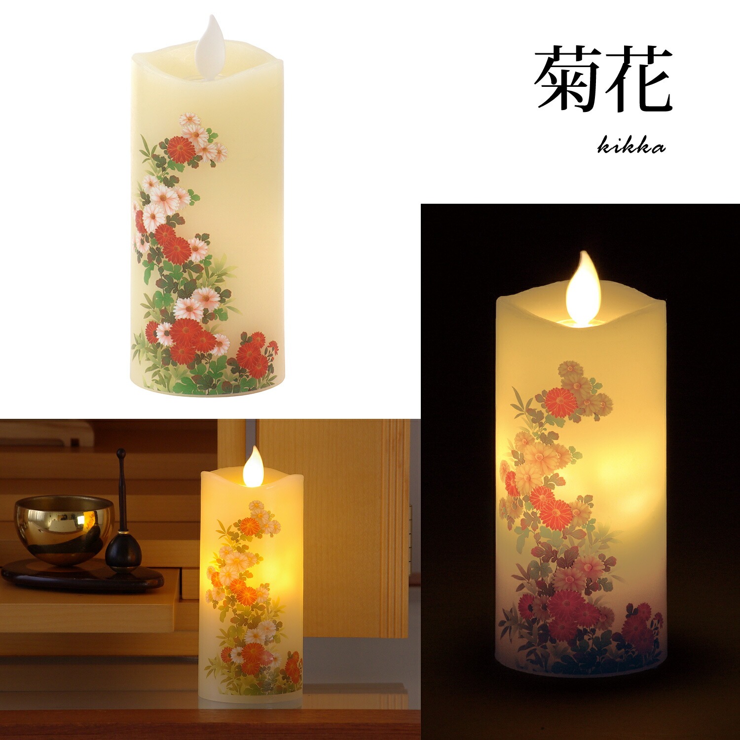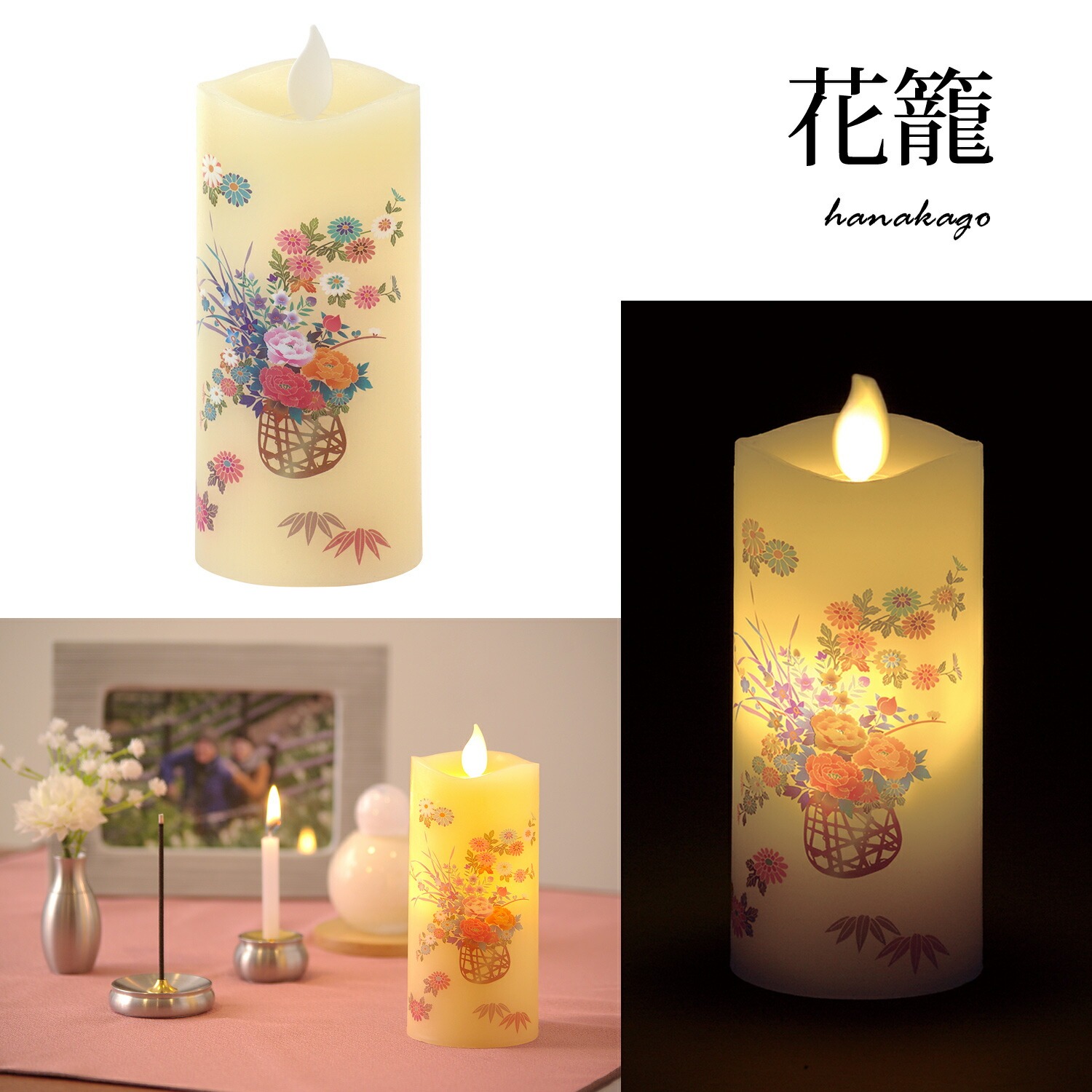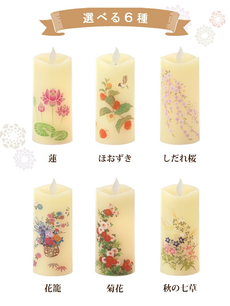 ◆カメヤマ いろはあかりS LEDローソク (テスト用単3電池 2本付き) ・蓮 ・ほおずき ・しだれ桜 ・花籠 ・菊花 ・秋の七草 連続点灯時間:約150時間 小函寸法:W60×L60×H150mm