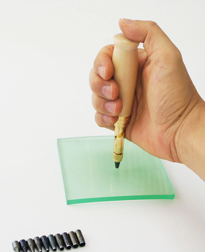 ドライバーのように下に押し込むと刃のみが回転し女性の方でも簡単に穴が開けられます。