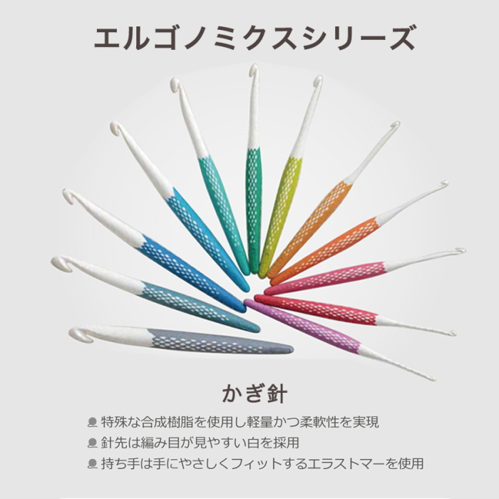適度な丸みを帯びた持ち手部分にラバーグリップがついているので、手や肩に無理な負担がかかりづらく編み物が快適に可能となります。