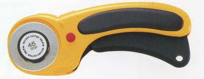 オルファのセーフティロータリーカッター。ロータリーカッターは薄手からキルティングなどの厚手まで曲線も直線も思いのままにカットできるロータリーカッターです。