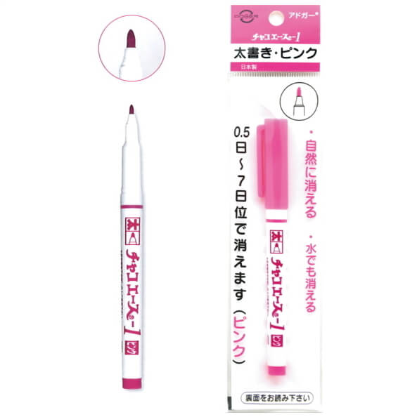 芯の素材を高級にしたチャコエース1シリーズ。 水性チャコペンの定番、アドガーの「チャコエース」シリーズに太軸の新シリーズが誕生しました。 和裁や洋裁、パッチワーク、刺繍も最適で目の粗い布地でもしっかりと線がかけます。 しかも、ペン先が書きやすくつぶれにくくなっています。 チャコエースペンのインクの特性は、水性ペンなので軽いタッチで書けます。 自然に消える早さは素材、温度、湿度、筆圧等の条件により異なります。 マーカータイプなのでインクが多ければ多い程、消える速度は、遅くなります。 紫・ピンク..自然に消える、水でも消えるタイプです。 ホワイト..自然に消える、水でも、アイロンでも消えるタイプ です。 ブルー...水で消え、自然には消えません。 手づくり商品は手芸の山久で。 当店では納品明細をメールにてお送りしています。商品到着時にご確認下さい。