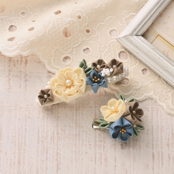 コットン生地を使用したつまみ細工でバレッタとブローチを作りましょう!