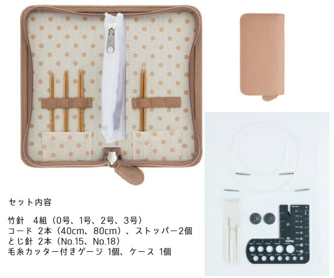 | セット内容 | ・竹針:4組 0号(2.10mm)、1号(2.40mm)、2号(2.70mm)3号(3.00mm) ・コード:2本 40cm、80cm ・ストッパー:2コ ・とじ針:2本 No.15(1.35×54.5mm)、No.18(1.07×45.5mm) ・毛糸カッター付きゲージ:1コ ・収納ケース:1コ |