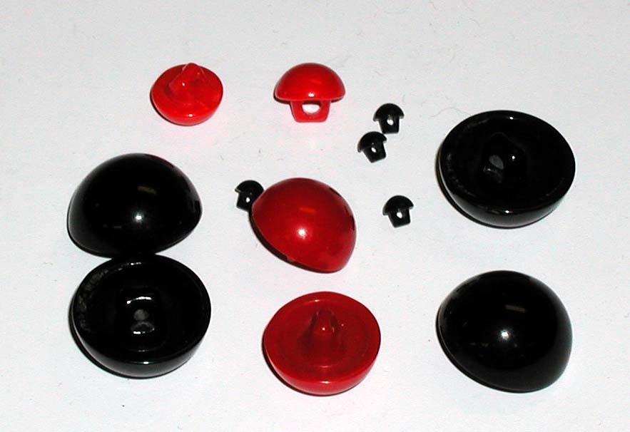 目玉(半丸)ボタンはぬいぐるみ、あみぐるみを作るのに必要です。色は黒と赤、サイズは4mm〜13mmまでは6個1袋、15mm・18mmは4個1袋となっています。