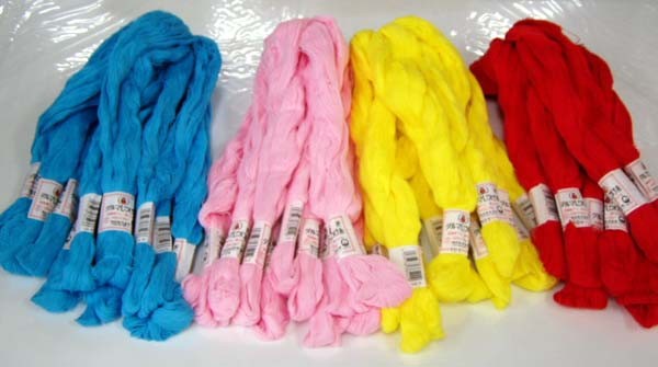 綿100%40番420m。しつけ、仮縫い、きりしつけ、いせこみなどに使います。色はピンク、黄、ブルー、赤の4色です。10かせ1束単位のお買い得です。