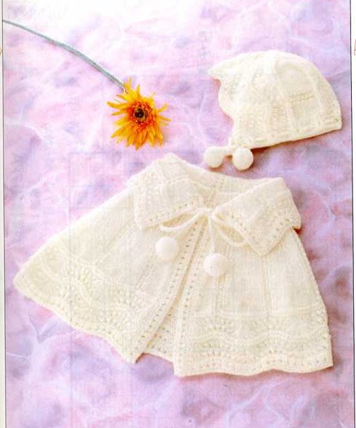 かわいい赤ちゃんケープは生成(#2)4玉、帽子は生成(#2)1玉で編むかわいいベビーセットです。