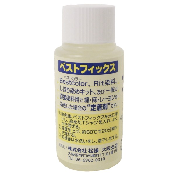 染色した衣類を、ベストフィックス10ml(キャップ2杯)を溶かした2.5Lの溶液(60℃)に20分間漬けておくだけで手軽に加工ができます。 ※天然染料(草木染め)やポリエステル用染料に使用しても効果はありません。 ※染め方などのお問い合わせは 株式会社松謙 TEL:06-6902-0333 まで。 | | 内容量 | 60ml(Tシャツ6枚=750g分) |