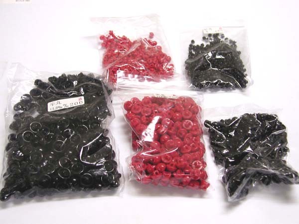 色は黒と赤、サイズは1袋約100個入りのお徳用です。グループで作ったり、バザーに出品するには数があって安いほうがよさそうなのでマニア用の大口バラも始めましたこの半丸目玉ボタンは足が後ろにつき抱が後ろに突き出しているタイプです。