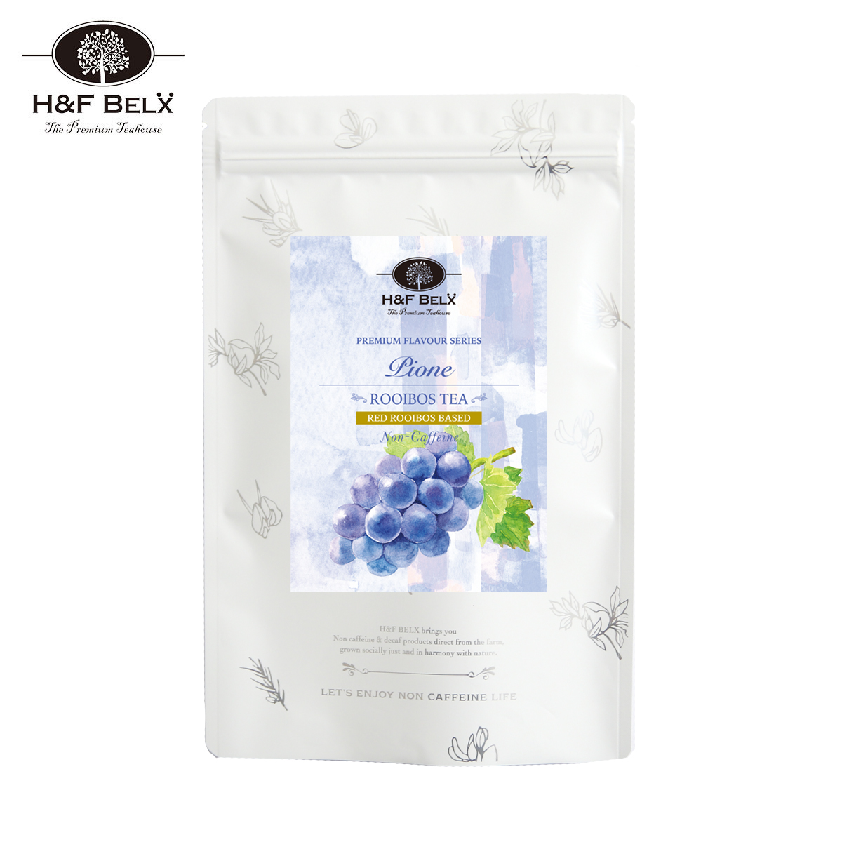 巨峰とマスカットをかけ合わせて生まれたピオーネは、強い甘みと爽やかな酸味ですっきりとした上品な味わいが特徴。 ベースのピュアルイボスティーが風味を引き立たせ、ホットでもアイスでも甘く芳醇な香りが口いっぱいに広がる贅沢なお茶に仕上がりました。