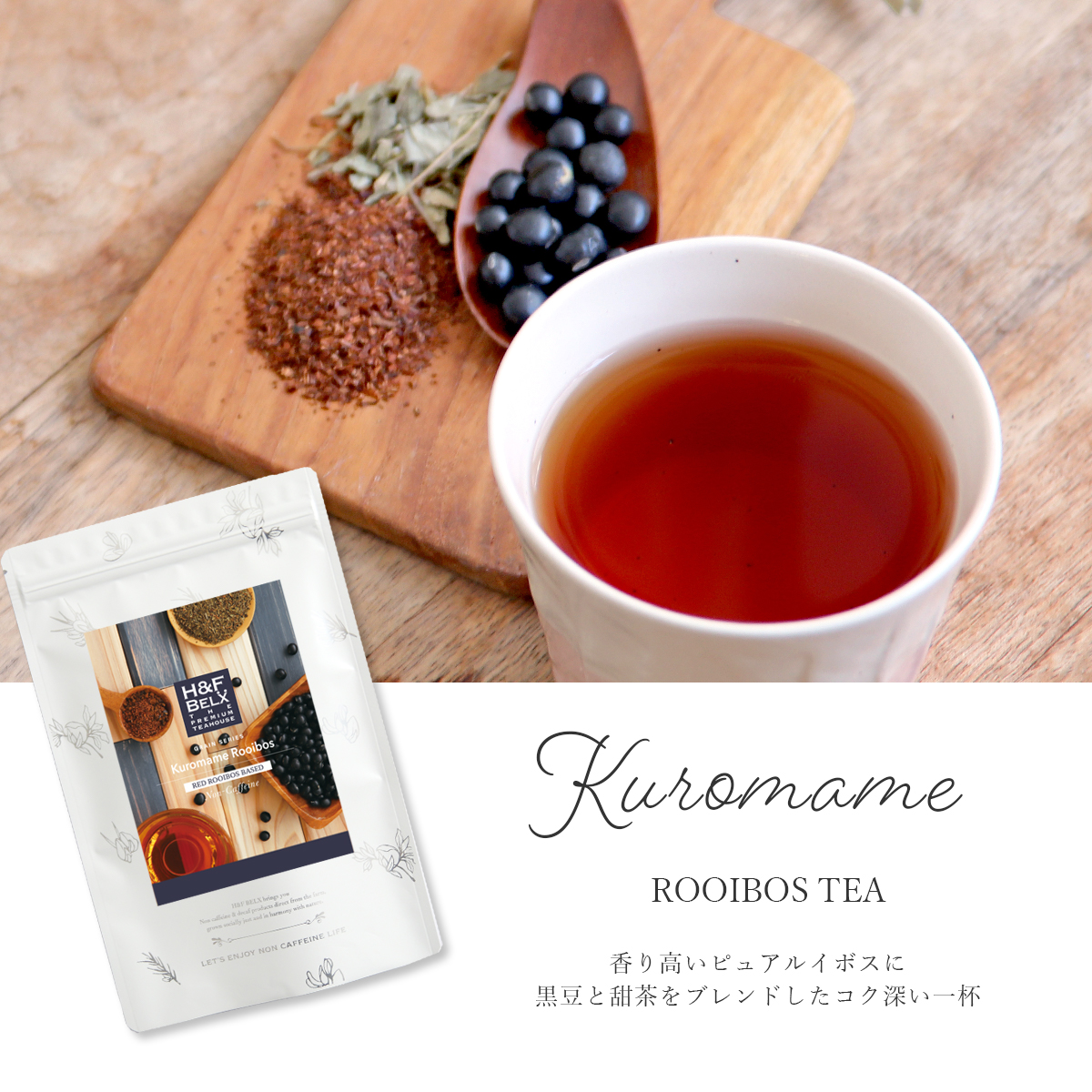 | 原材料 | 有機ルイボス(南アフリカ共和国)、黒豆(国産)、甜茶(中国)/ 香料(一部に大豆を含む) |