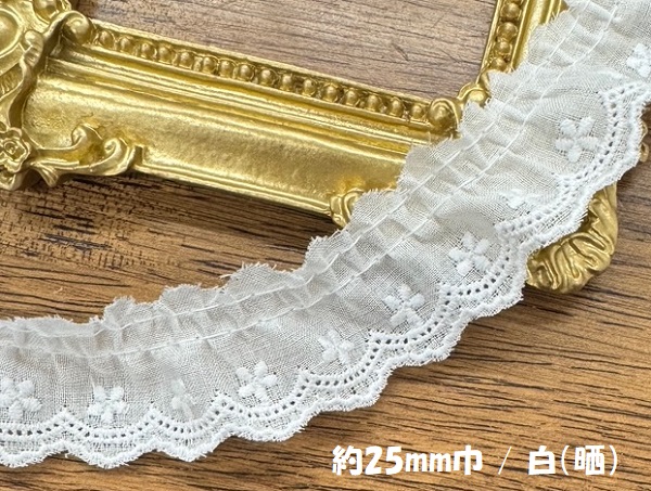 フリルレース 【日本製】ホワイト 花柄 約25mm巾 No.KY23412F ギャザーレース コットンフリルレース