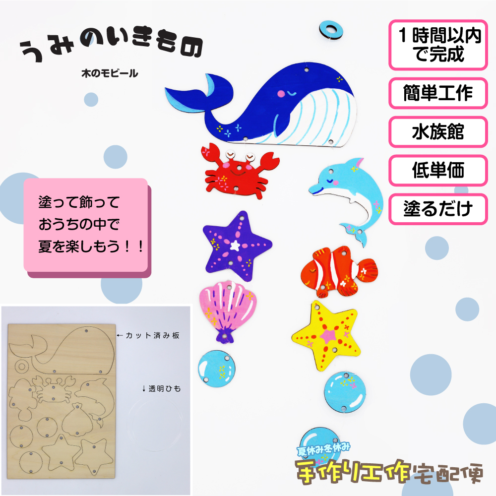塗って紐を結ぶだけで海の生き物のモビールが作れて飾れる工作キットです。