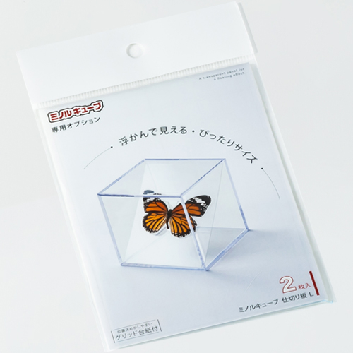 ・浮かんでみえる!?アイテムを斜めに展示できるミノルキューブ専用透明仕切り板です。