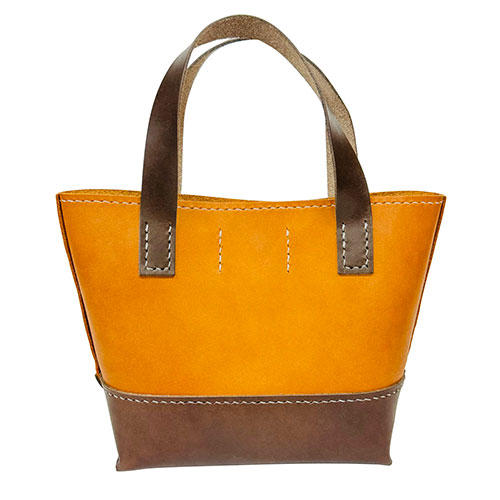 ・姫路オイルレザーでつくるミニミニトートバッグです。色は本体がイエロー、持ち手と底部分がチョコです。