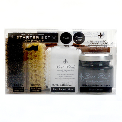 セット内容:ブートブラックシルバーラインシュークリームブラック(30g)×1、ブートブラックシルバーラインツーフェイスローション(30mL)×1、馬毛ブラシ(汚れ落とし用)×1、豚毛ブラシ(磨き込み用)×1、クロス×1、グローブクロス×1