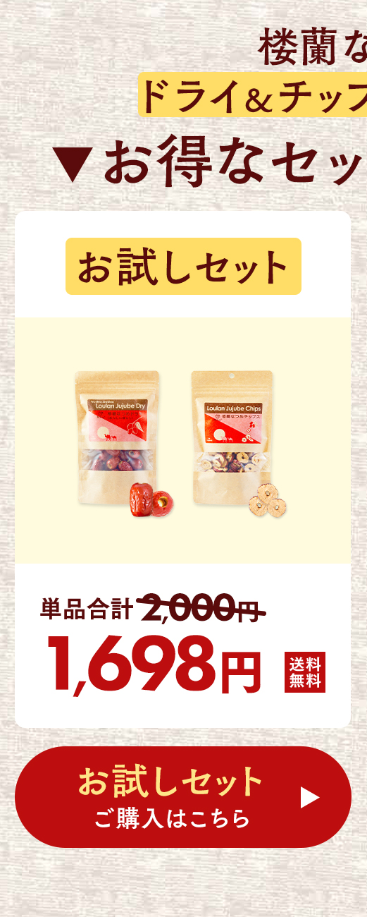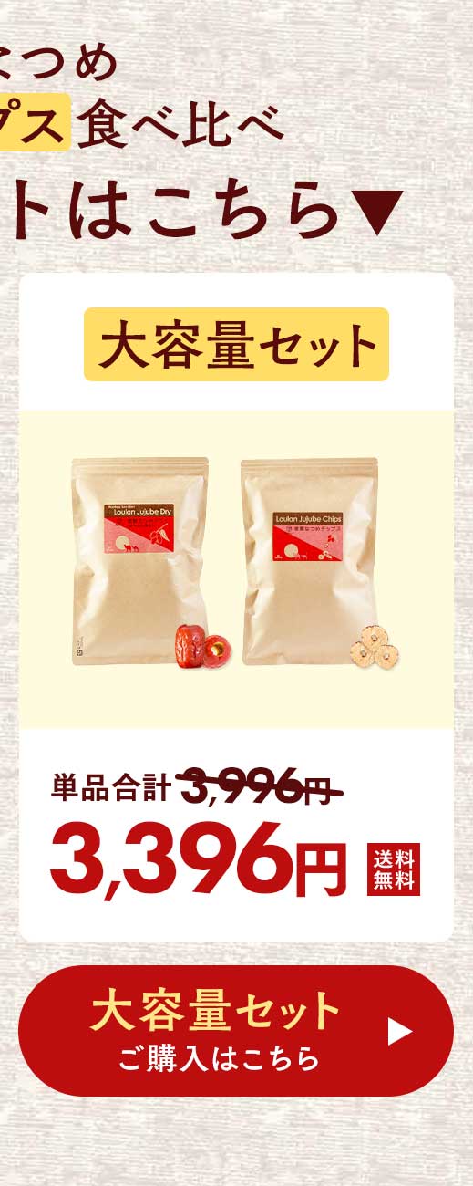 | 使用方法 | ※実の中に両端が鋭く尖った種が入っていますので、必ず先に取り出してからお召し上がりください。 ※お召し上がりの際、実の中の種をお子様やご年配の方が誤って飲み込まないようにくれぐれもご注意ください。 洗わずそのままお召し上がりいただけます。 ●1日あたりの目安:食品ですので、特に決まりはありません。ご参考までに、中国には「一日食三棗 終生不顕老」という言い伝えがあります。大なつめドライ3個(約40g)。 ※一度に食べ過ぎると、ご体質により、胃腸に刺激を与える場合がありますのでご注意ください。 ※天然由来のため、収穫年や商品ごとに色、味、香りにバラつきが生じることがありますが、品質には問題ありません。 |