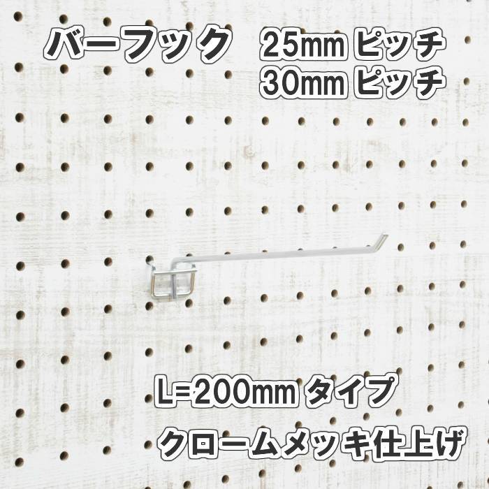 有孔ボード用 バーフック L= 200mm 長さ クロームメッキ仕上 1個入 25mm 30mm ピッチ 銀 シルバー 吊り下げ 小物掛け 金具 DIY インテリア アサヒ