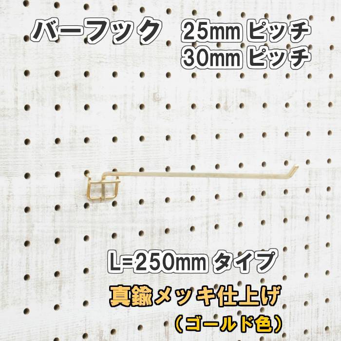 有孔ボード用 バーフック L= 250mm 長さ 真鍮メッキ仕上げ 1個入 25mm 30mm ピッチ 金 ゴールド 吊り下げ 小物掛け 金具 DIY インテリア アサヒ 多孔ボード