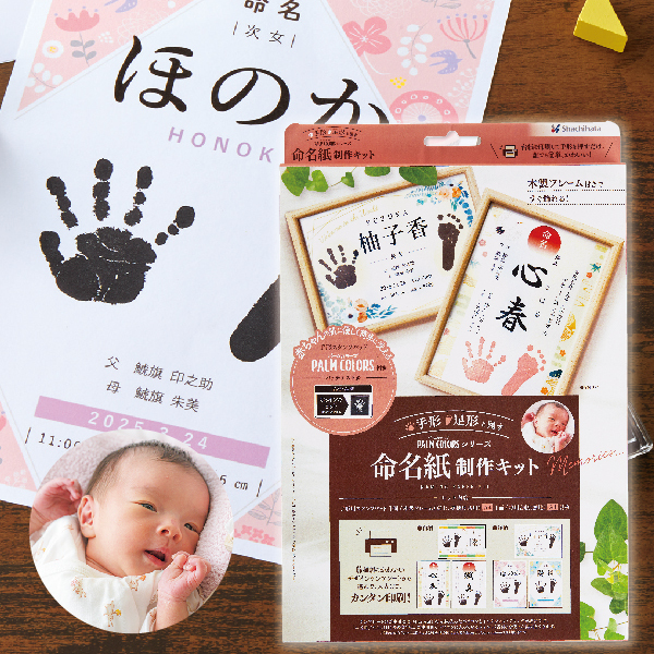 | 特徴 | お好きなデザインの台紙を印刷し、お子様の誕生記念として、手形・足形と一緒に残せる命名紙制作キットです。 手形・足形を捺すだけで簡単に可愛い命名紙を作ることができます。 |