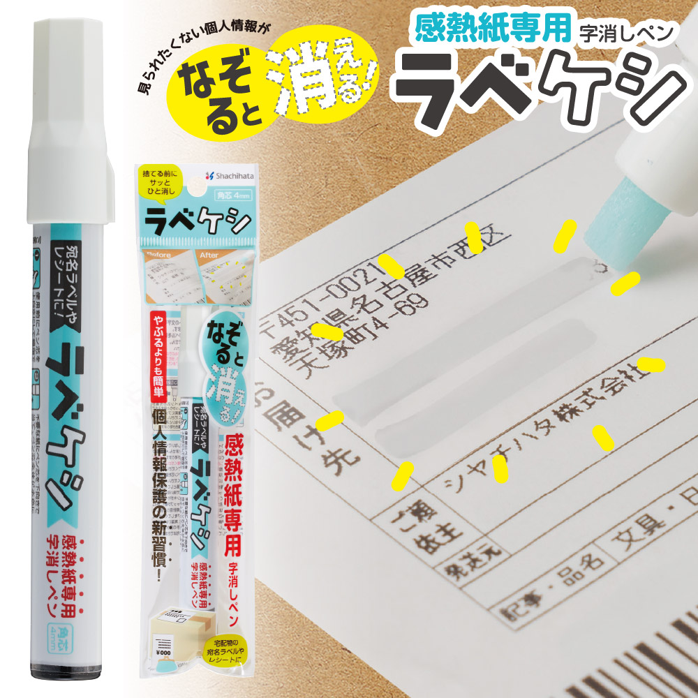 | 特徴 | 感熱紙専用の字消しペン「ラべケシ」です。 感熱紙の文字を“なぞるだけ”でスッと消える 宛名ラベルやレシートなど、感熱紙に印字された文字を簡単に無色化できる便利アイテムです。 気になる個人情報部分をサッとなぞるだけで文字が見えなくなり、そのままゴミ箱へ捨てられます。 |