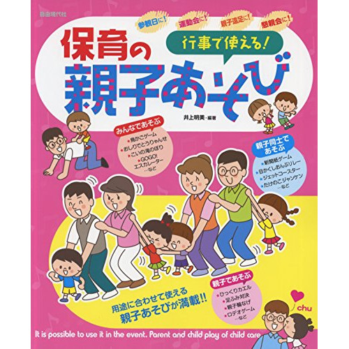 行事で使える!保育の親子あそび1 . ■【親子であそぶ】 遊びと歌(♪)/2 . ひっくりカエル/丸太たおし/ふれあいあそび/3 . 足ふみ対決/おしりタッチ/とんでとんでくぐって!/4 . ジャンケンこちょこちょ/帽子とりゲーム/すばやくタッチ/5 . ロデオゲーム/親子ストレッチ/親子輪なげ/6 . てんぐの鼻 (♪)/7 . くっつきぼうずのうた (♪)/8 . どうぶつの親子 (♪)/9 . 子どもと子どもがけんかして (♪)/10 . なにがなんだか (♪)/11 . 一丁目のドラネコ (♪)/12 . せんたくじゃぶじゃぶ (♪)/13 . パンやさんにおかいもの (♪)/14 . かってもまけても (♪)/15 . ■【親子同士であそぶ】 遊びと歌(♪)/16 . 上ばきさがし/お父さんお母さんさがし/新聞紙ゲーム/17 . 風船はこびリレー/親がめ子がめリレー/目かくしおんぶリレー/18 . ジェットコースター/たけのこジャン