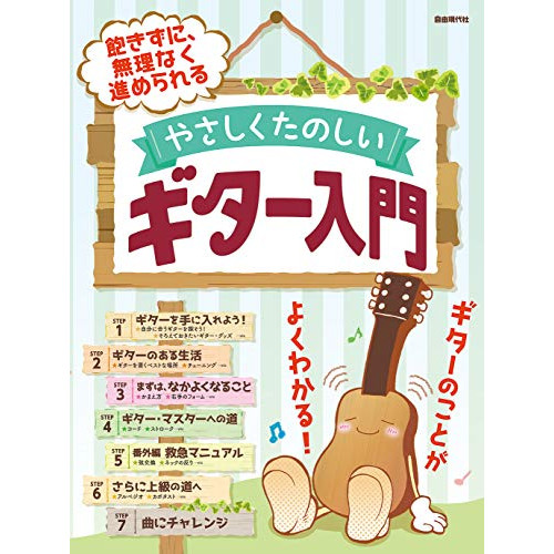 やさしくたのしいギター入門1 . WHAT'Sギター/2 . ギター各部の名称と機能/3 . ギター・カルテ/4 . ギターくんのなかま/5 . ■STEP1 ギターを手に入れよう!/6 . 自分に合うギターを探そう!/7 . 健康的なギターの見分け方/8 . 選ぶポイント/9 . そろえておきたいギター・グッズ/10 . 弾くときに使う/11 . お手入れするときに使う/12 . 保管するときに使う/13 . 修理をするときに使う/14 . エレアコを持っているなら/15 . ■STEP2 ギターのある生活/16 . ギターを置くベストな場所/17 . 健康管理/18 . チューニング/19 . 楽譜というルール/20 . ギター専用の楽譜/21 . ギターのフレットと音の位置/22 . コードの種類/23 . 反復記号/24 . ■STEP3 まずは、なかよくなること/25 . かまえ方/26 . 右手のフォーム/27 . ギターの弾き方/28 . ピックを使って弾く/29 . 指で弾く/30 . 左手