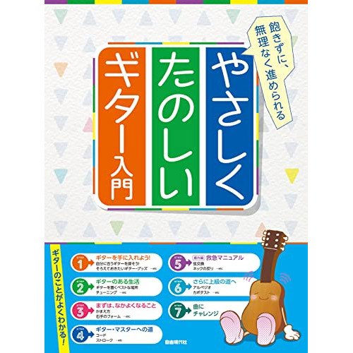 やさしくたのしいギター入門1 . WHAT'Sギター/2 . ギター各部の名称と機能/3 . ギター・カルテ/4 . ギターくんのなかま/5 . ■STEP1 ギターを手に入れよう!/6 . 自分に合うギターを探そう!/7 . 健康的なギターの見分け方/8 . 選ぶポイント/9 . そろえておきたいギター・グッズ/10 . 弾くときに使う/11 . お手入れするときに使う/12 . 保管するときに使う/13 . 修理をするときに使う/14 . エレアコを持っているなら/15 . ■STEP2 ギターのある生活/16 . ギターを置くベストな場所/17 . 健康管理/18 . チューニング/19 . 楽譜というルール/20 . ギター専用の楽譜/21 . ギターのフレットと音の位置/22 . コードの種類/23 . 反復記号/24 . ■STEP3 まずは、なかよくなること/25 . かまえ方/26 . 右手のフォーム/27 . ギターの弾き方/28 . ピックを使って弾く/29 . 指で弾く/30 . 左手