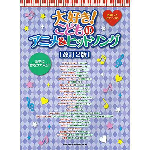 大好き!こどものアニメ&ヒットソング(改訂2版)1 . ブライトファンタジー/2 . CHANGE MY WORLD/3 . XY&Z/4 . 超絶ダイナミック!/5 . 名探偵コナン メインテーマ/6 . 謎/7 . 待ったなんてなしっ!/8 . キミに100パーセント/9 . 夢をかなえてドラえもん/10 . ゲラゲラポーのうた/11 . ようかい体操第一/12 . サザエさん一家/13 . サザエさんBGM サブタイトル4/14 . おどるポンポコリン/15 . トリセツ/16 . SHARE THE LOVE/17 . 好きだ。/18 . FOLLOW ME/19 . R.Y.U.S.E.I./20 . もんだいガール/21 . DRAGON NIGHT/22 . 私以外私じゃないの/23 . キミアトラクション/24 . プライド革命/25 . 千本桜/