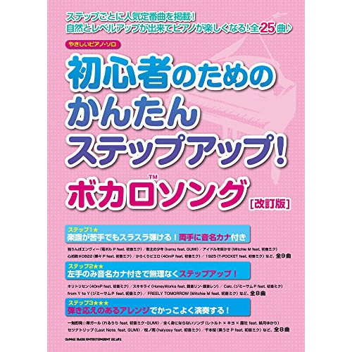 初心者のためのかんたんステップアップ!ボカロソング(改訂版)1 . ■ステップ1 ★楽譜が苦手でもスラスラ弾ける!両手に音名カナ付き/2 . 独りんぼエンヴィー/3 . ワールズエンド・ダンスホール/4 . 敗北の少年/5 . 夜咄ディセイブ/6 . アイドルを咲かせ/7 . 心拍数♯0822/8 . からくりピエロ/9 . マトリョシカ/10 . 1925/11 . ■ステップ2 ★★左手のみ音名カナ付きで無理なくステップアップ!/12 . キリトリセン/13 . スキキライ/14 . Calc./15 . from Y to Y/16 . 妄想税/17 . 愛言葉/18 . FREELY TOMORROW/19 . 右肩の蝶/20 . ■ステップ3 ★★★弾き応えのあるアレンジでかっこよく演奏する!/21 . 一触即発☆禅ガール/22 . 全く身にならないソング/23 . すろぉもぉしょん/24 . セツナトリップ/25 . 桜ノ雨/26 . 虎視眈々/27 . イヤホンと蝉時雨/28 . 千本桜/