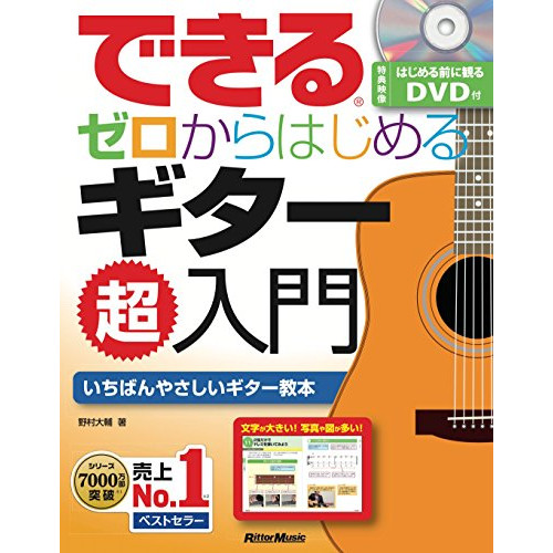 できる ゼロからはじめるギター超入門(DVD付)(音楽書)1 . ●本の内容/2 . 第1章 いきなり弾いてみよう/3 . 第2章 ドレミを弾こう/4 . 第3章 人差指1本でいろんなコードを弾いてみよう/5 . 第4章 人差指と中指でコードを押さえよう/6 . 第5章 リズム譜の読み方、ストロークを強化しよう/7 . 第6章 薬指と小指も加えてコードを押さえよう/8 . 第7章 人差指1本で複数の弦を押さえるコードを弾こう/9 . 第8章 薬指1本で複数の弦を押さえるコードを弾こう/10 . 第9章 コードネームのおさらいをしよう/11 . 第10章 課題曲を攻略して本書を卒業しよう/12 . ●DVDの内容/13 . ギターでできることを知ろう/14 . 弦を弾く複数の方法を知ろう/15 . プレイフォームを知ろう/16 . チューニングをしてみよう弦を交換してみよう/17 . ギター用の譜面=タブ譜の読み方/18 . コ