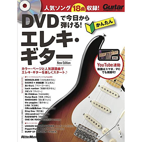 DVDで今日から弾ける!かんたんエレキ・ギター New Edition(DVD付)(音楽書)1 . ■プレイをはじめる前に/2 . ■ギター・プレイをはじめよう!/3 . ■エレキ・ギター・テクニックに挑戦!/4 . ■総合実践フレーズ集/5 . ■ギター・ノウハウいろいろ/6 . ■フル・コーラス・ギター・スコア/7 . 【かんたんギター・スコア収録曲】/8 . ●ワン・コーラスかんたんアレンジ(YouTube連動)/9 . DAOKO × 米津玄師「打上花火」/10 . あいみょん「マリーゴールド/11 . back numbe「高嶺の花子さん」/12 . MONGOL800「小さな恋のうた」/13 . Lisa「紅蓮華」/14 . Mr.Children 「HANABI」/15 . スピッツ「チェリー」/16 . Hump Back「拝啓、少年よ」/17 . the peggies「君のせい」/18 . SHISHAMO「君と夏フェス」/19 . Alexandros「ワタリドリ」/20 . King Gnu「飛行艇」/21 . ONE OK ROCK「完全感覚Dreamer」/22 . Official髭